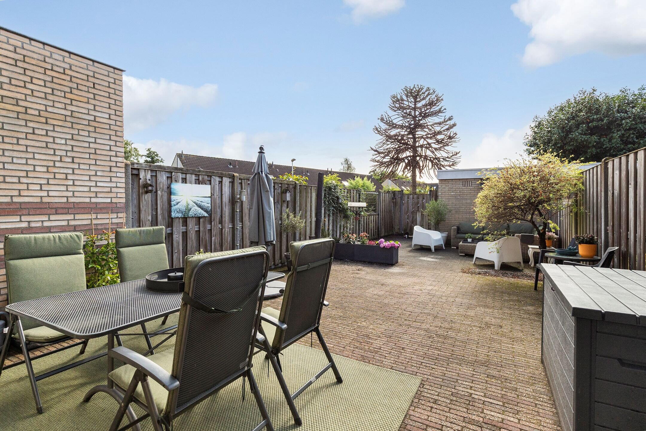 Ruime, zonnige achtertuin met achterom